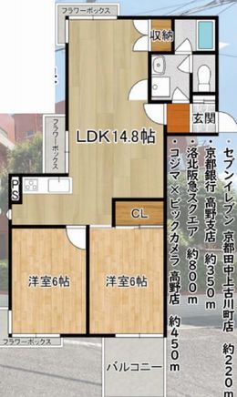 | 交通 | 叡山電鉄叡山本線 一乗寺駅 7分 | 専有面積 | 56.79u | バルコニー面積 | 4.00u |
