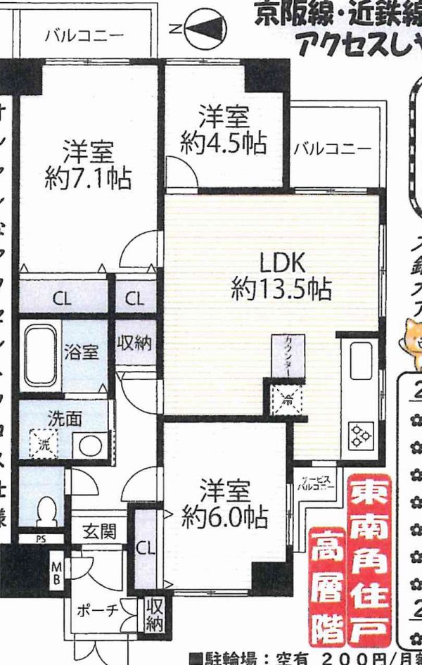 | 交通 | 京阪本線 中書島駅 8分 | 専有面積 | 67.50u | バルコニー面積 | 7.02u |